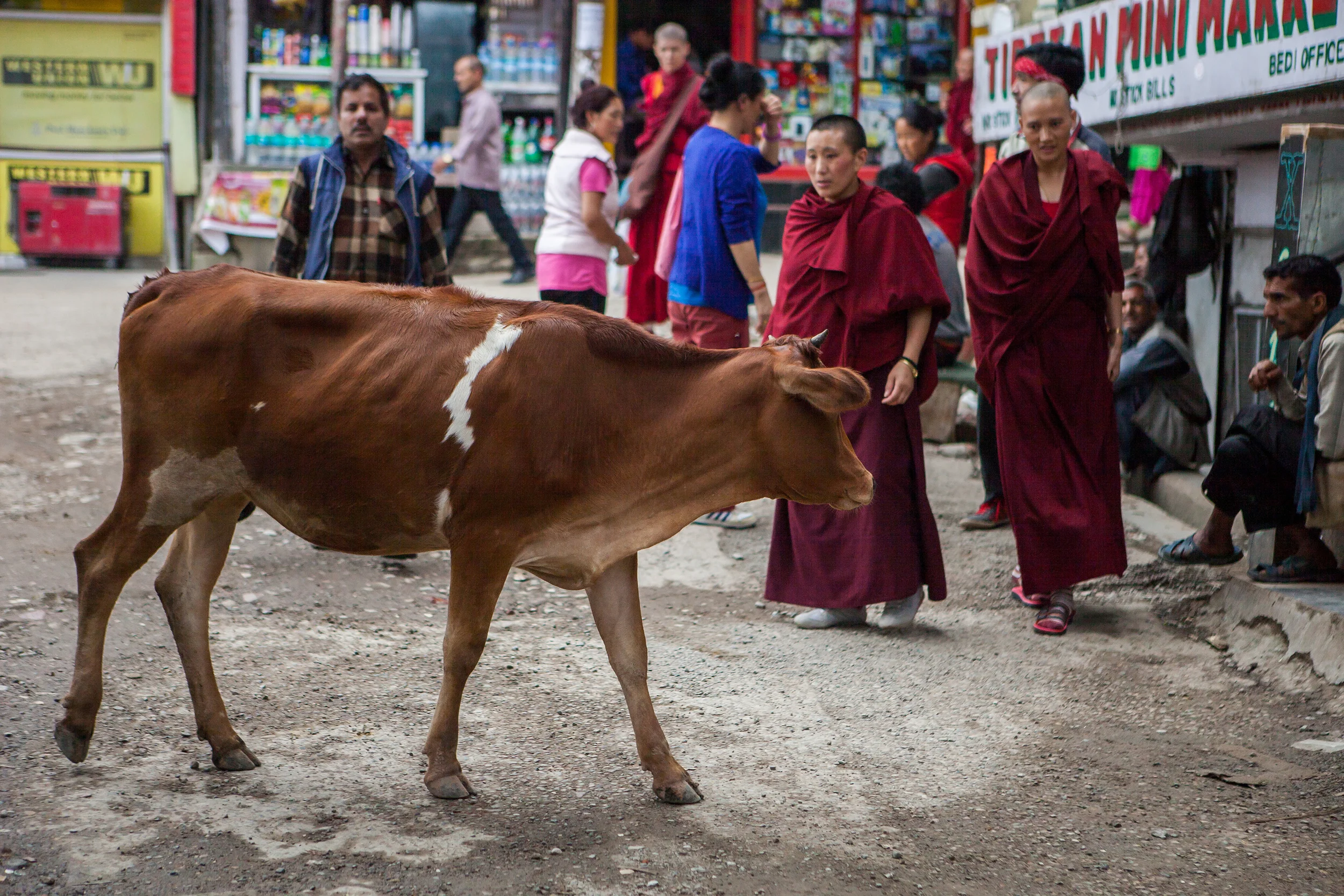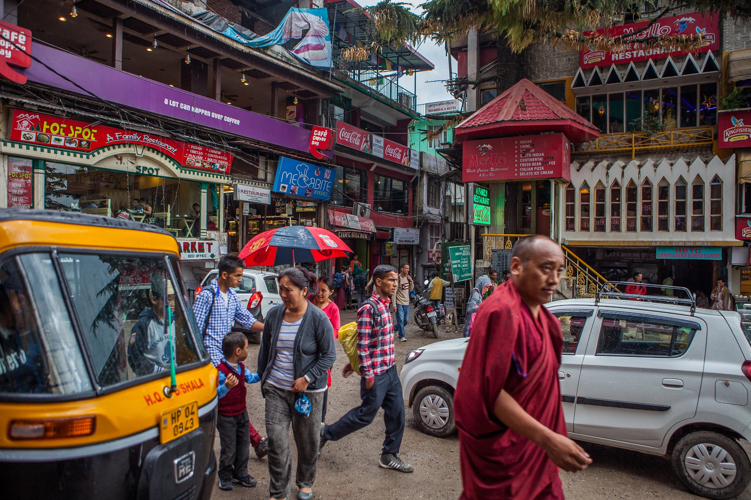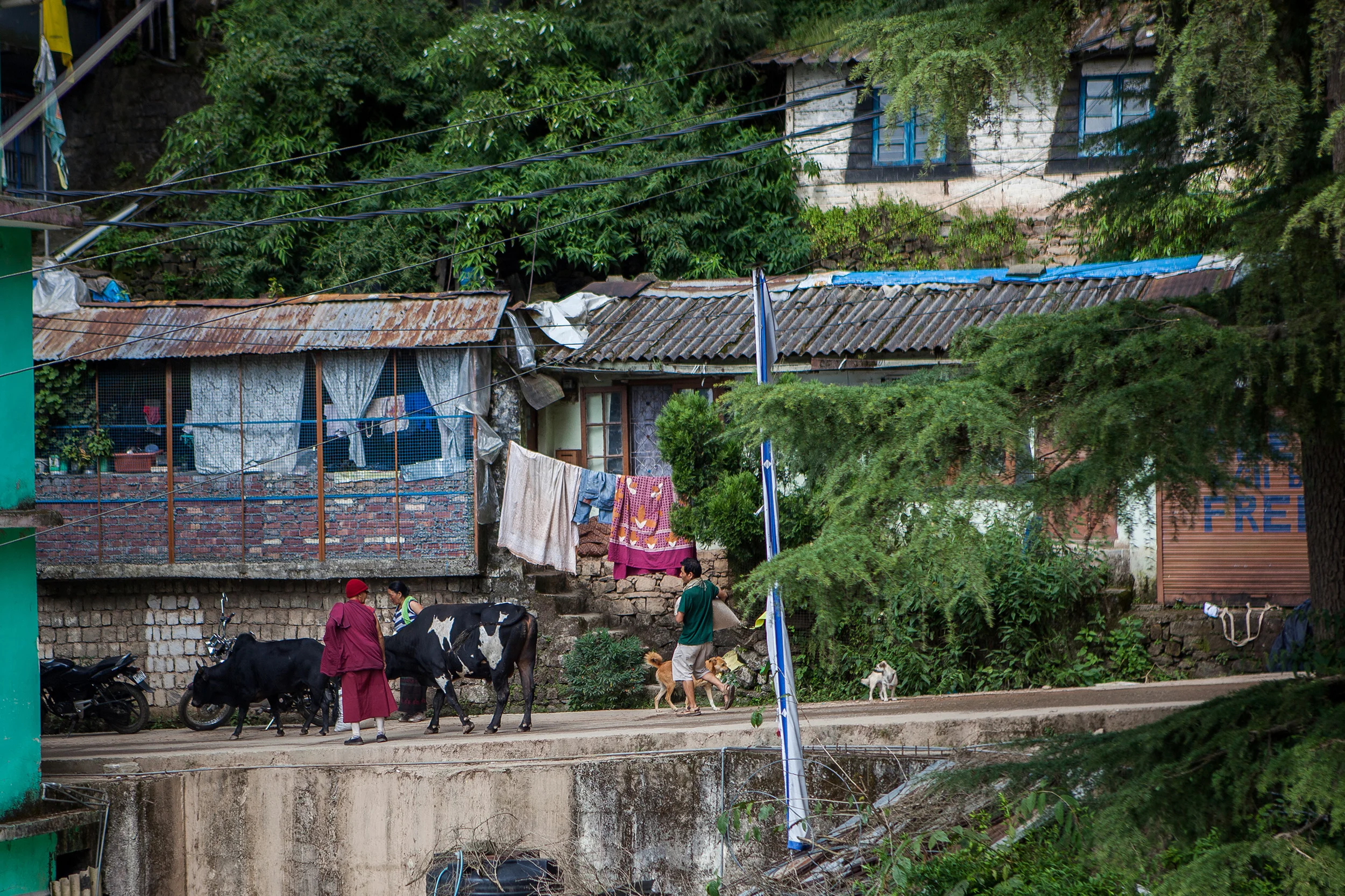 We'd been in McCleodganj, home to the exiled Tibetan government and the Dalai Lama in India, for a week at this point. We'd already grown to love its muddy streets tucked into the Himalayan foothills and the incongruous sight of red-robed monks with iconic white earbuds protruding from their ears or gathered around a computer screen in a small coffee shop. We loved the mix of Indian and Tibetan culture and the dreadlocked, backpacking travelers who came to pray or meditate or learn yoga or simply be in this fascinating (and extremely inexpensive!) place. We loved watching the stray dogs sleep against murals and get their heads patted by passing nuns or small morsels tossed to them by pink-cheeked shop owners. We even loved how there were constant intermittent power outages and how we could be in the middle of dinner at a restaurant, the power would go out, and someone would simply go around and light the candles on the tables while no one, diner or server alike, blinked for even a moment.
